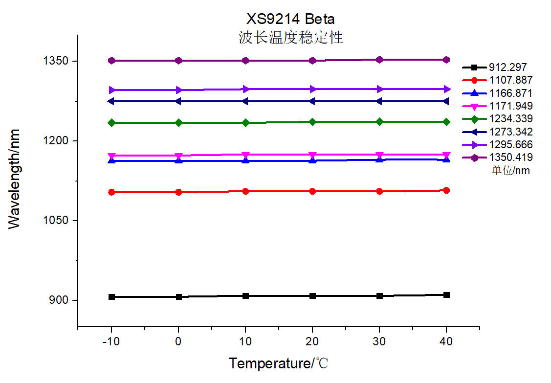 而XS9214 Beta的另一大特點,是創新型的製冷係統。在CCD製冷與外界輔助製冷的二階製冷模塊基礎上,自帶了一個控溫模塊,可以對製冷溫度進行精準調控。擁有如此強大的製冷能力,XS9214 Beta在不同溫度下進行光譜探測的穩定性得到了有力的保障,可以最大程度屏蔽外界環境的幹擾影響,在藥品、食品質量控製,植株育種監測等工業、農業應用上有極大應用前景。下方是XS9214 Beta的穩定性測試曲線。